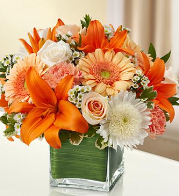 Let the healing power of an elegant sympathy arrangement send a soothing message during times of loss. A colorful bouquet of roses, Gerberas, cremones, lilies and more in comforting shades of peach, orange and white are designed in a cube vase to express your care and concern beautifully.